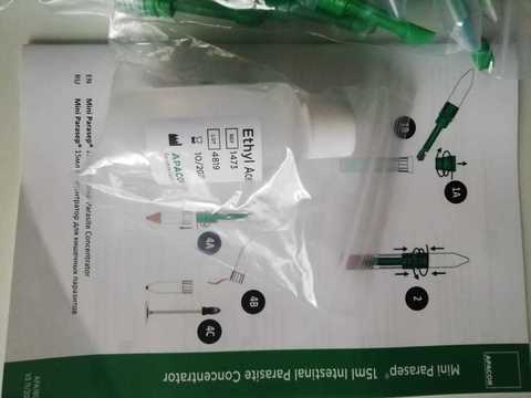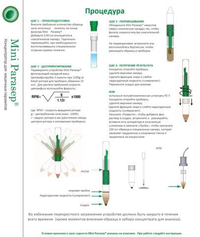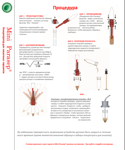 Состав набора: 40 пробирок для пробы с 10% формалином (по 2,4 мл), 40 конических камер с фильтрами-шпателями, флакон 40 мл с этилацетатом.