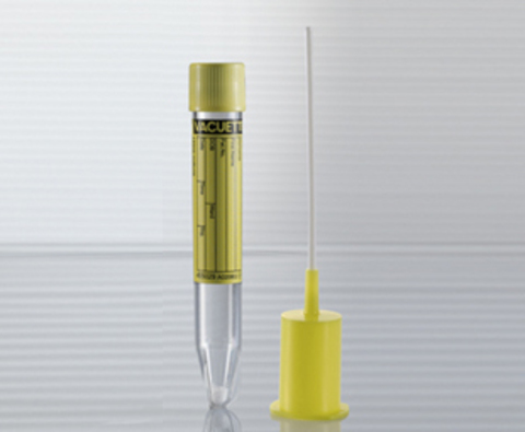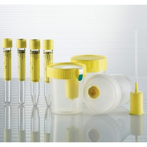 Комплект из держателя и пробирки вакуумной VACUETTE® без добавок для сбора мочи. Пробирка пластиковая (455028) имеет коническое дно, с бумажной этикеткой, желтой крышкой без резьбы и желтым идентификационным кольцом; размеры 16х100 мм, объем забираемой пробы до 9 мл. Держатель для переноса мочи (450251) с коротким 100 мм пробозаборником. В индивидуальной упаковке